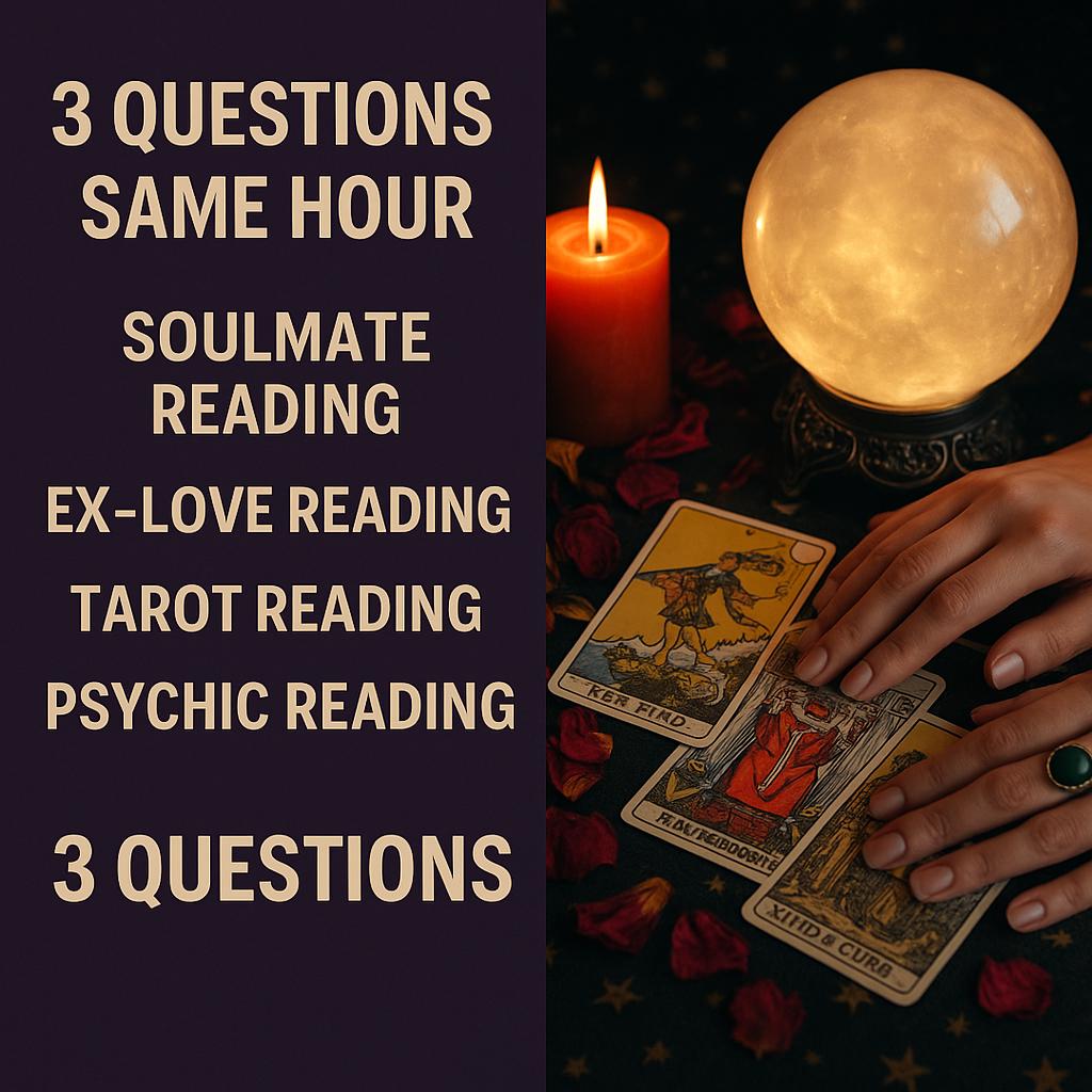 This Same Hour Tarot Reading gives you fast, precise, and personalized answers to your three questions about love, relationships, ex-partners, soul connections, or emotional clarity.