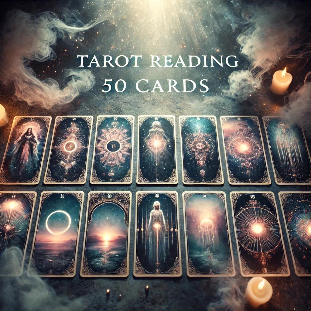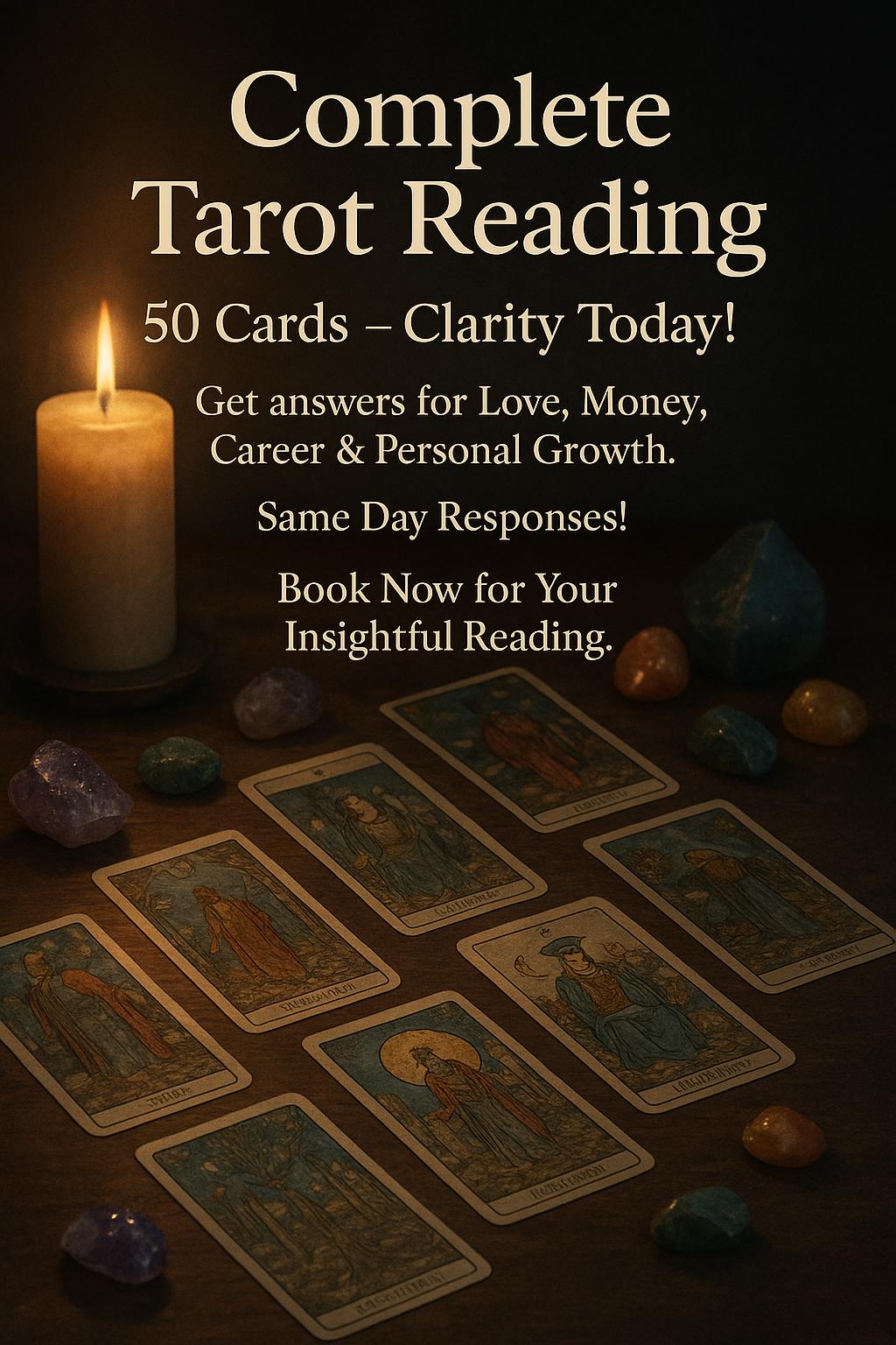 This comprehensive tarot reading provides deep insight into your love life, career choices, future direction, and spiritual clarity. With a powerful 50-card spread, you can ask up to 5 personalized questions, receiving detailed guidance within 24 hours.